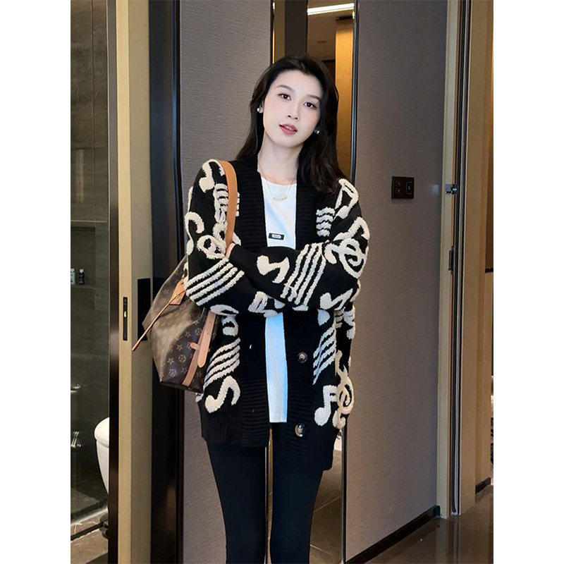宽松慵懒风提花针织开衫女秋季黑色中长款小众设计感时尚毛衣外套
