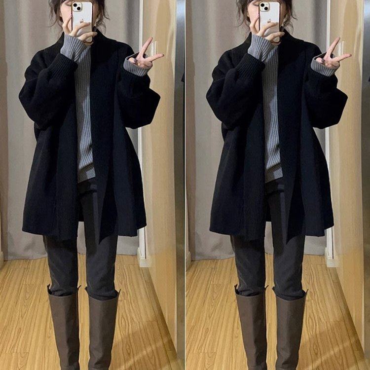 粗毛线保暖黑色毛衣外套女中长款秋冬新款加厚韩系宽松针织开衫女