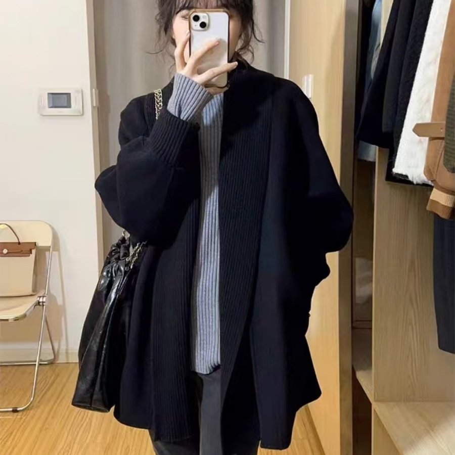 时尚中长款针织衫女春秋新款慵懒风黑色毛衣开衫宽松长袖上衣外套