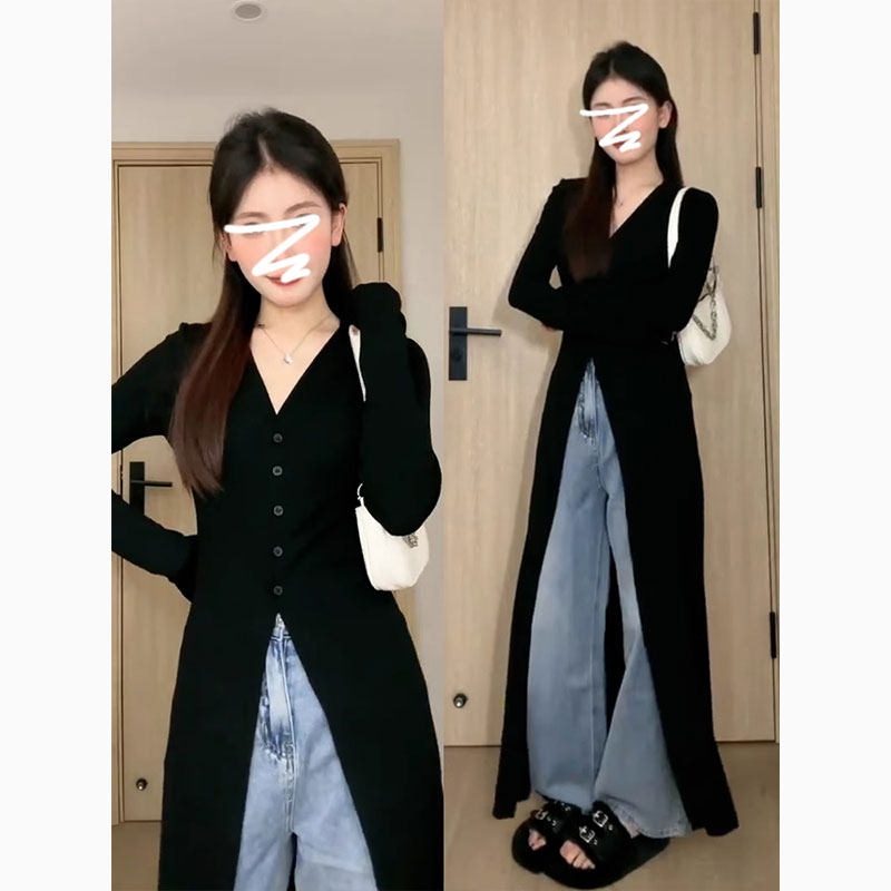 黑色v领针织开衫毛衣外套女秋季2025新款独特别致中长款开叉上衣