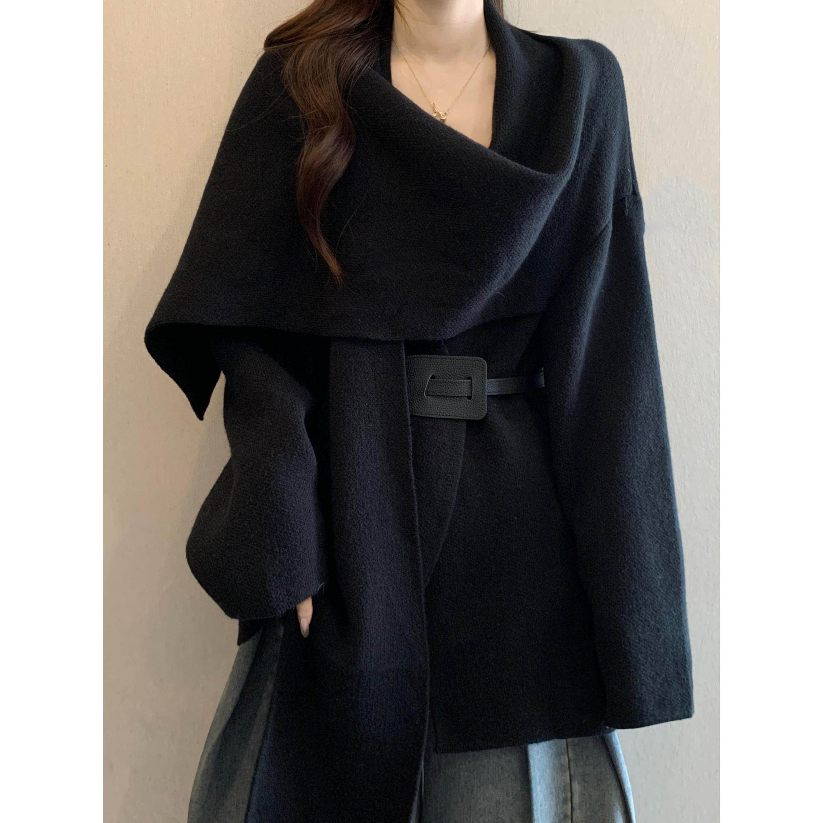 韩系慵懒风黑色翻领毛衣外套女冬季高级感气质收腰中长款针织开衫