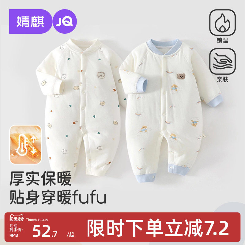 婧麒新生婴幼儿衣服秋冬保暖夹棉连体衣小月龄宝宝无骨外出哈衣秋