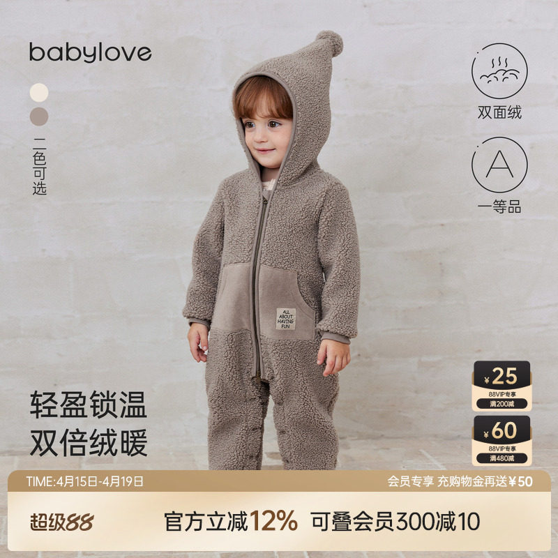 babylove婴儿连体衣秋冬纯色加绒保暖哈衣毛绒爬服宝宝连帽外出服