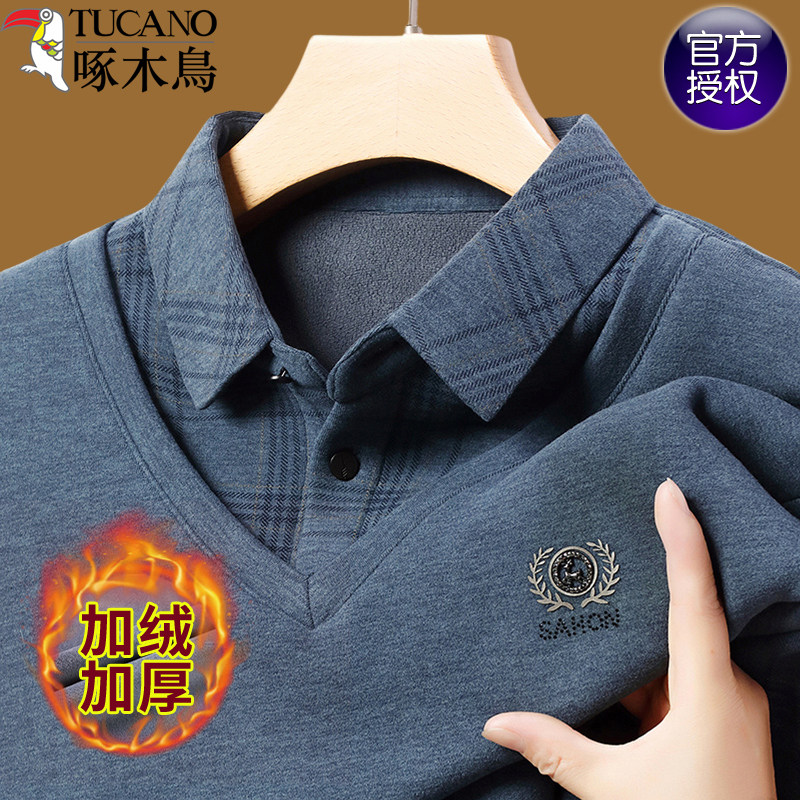 啄木鸟秋冬男士加厚加绒假两件中青年打底衫保暖宽松毛衣男羊毛衫