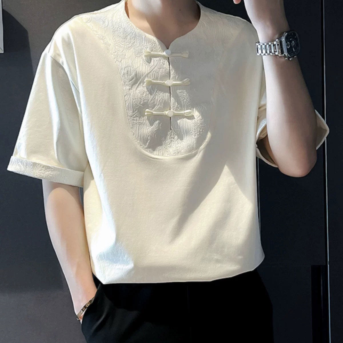 新中式无领痞帅短袖t恤男士2025夏季新款休闲半袖体恤青年打底衫