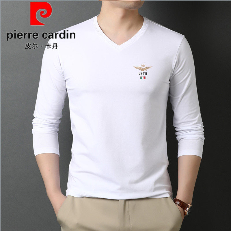 啄木鸟春秋季桑蚕丝V领长袖t恤男士潮流青年打底衫丝光棉上衣男装