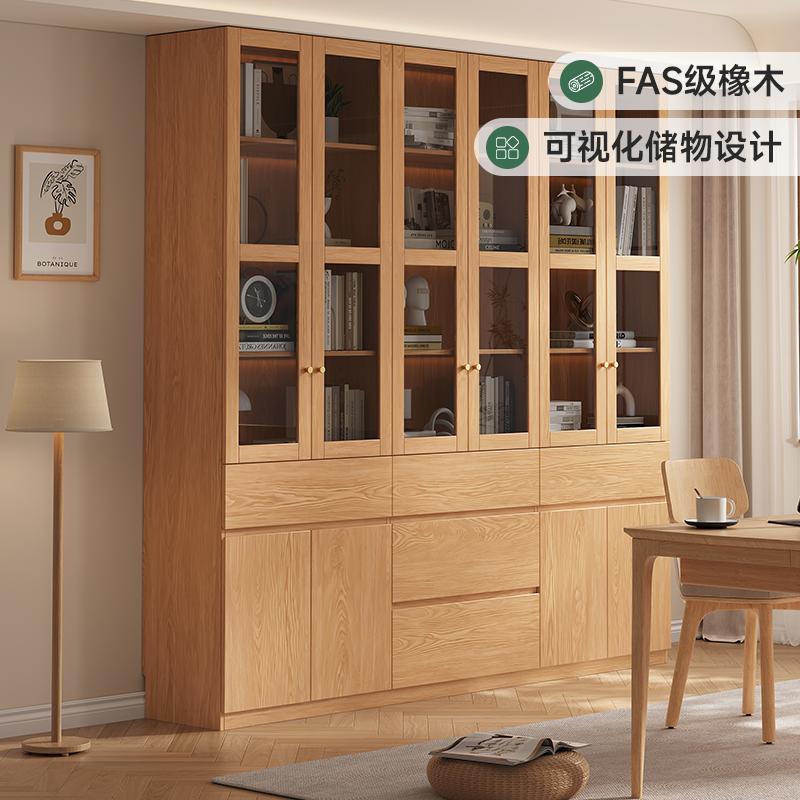 定制实木书柜满墙橡木收纳柜家用玻璃到顶展示柜落地自由组合书架