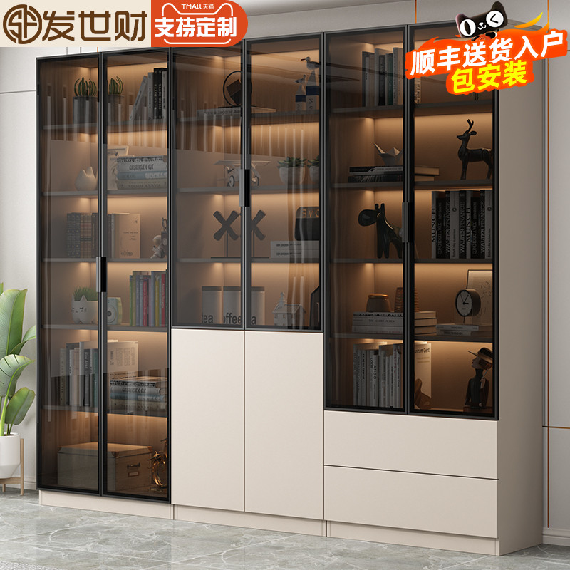 书柜自由组合书架实木定制玻璃门书橱推拉门轻奢客厅家用展示柜子