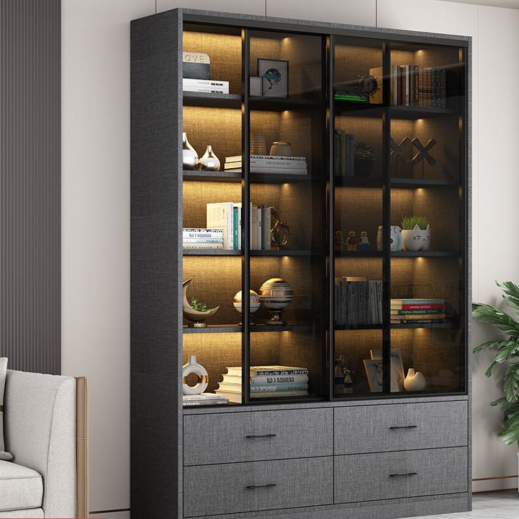 轻奢推拉门书柜自由组合书架实木定制玻璃门家用展示柜子书橱客厅