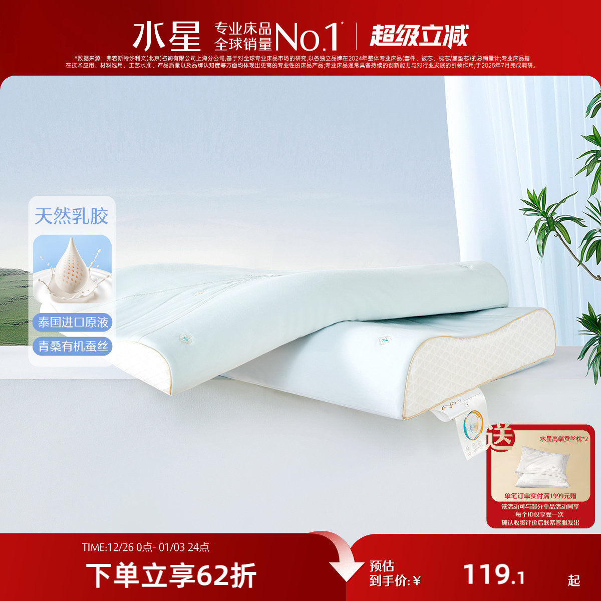 水星家纺泰国原液进口天然乳胶枕芯A类呵护颈椎枕头青桑有机蚕丝