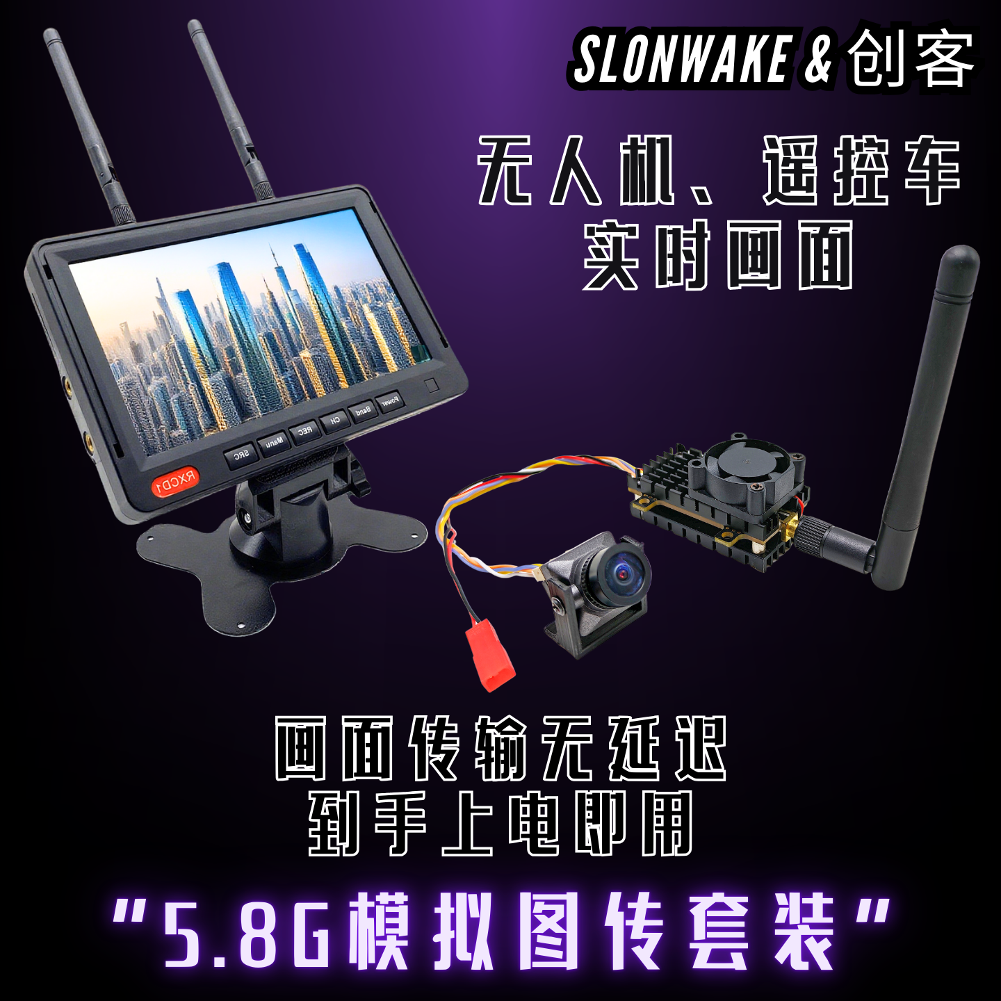SLONWAKE 5.8G 2W模拟图传7寸高亮屏1500TVL模拟摄像头图传套装