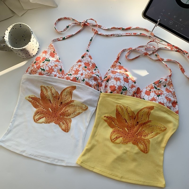 多巴胺黄色花朵印花带胸垫抹胸吊带背心女泰式绝美海边度假两件套
