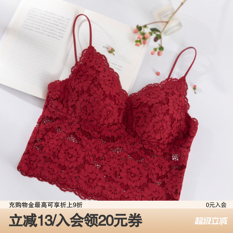 红色内衣女裹胸吊带蕾丝带胸垫抹胸美背心一体聚拢文胸防走光性感