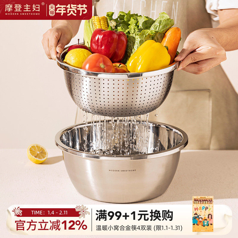 摩登主妇304不锈钢盆洗菜盆沥水网篮家用食品级加厚滤水篮沥水盆