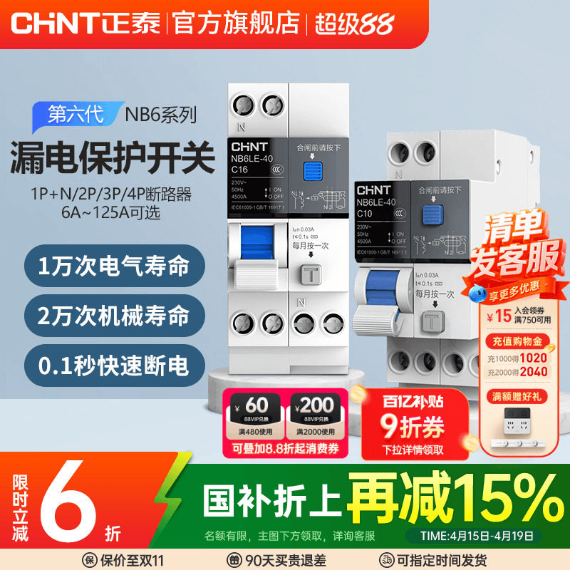 正泰空气开关带漏电保护NB6LE断路器2P3P家用63A空开漏保1P+N电闸