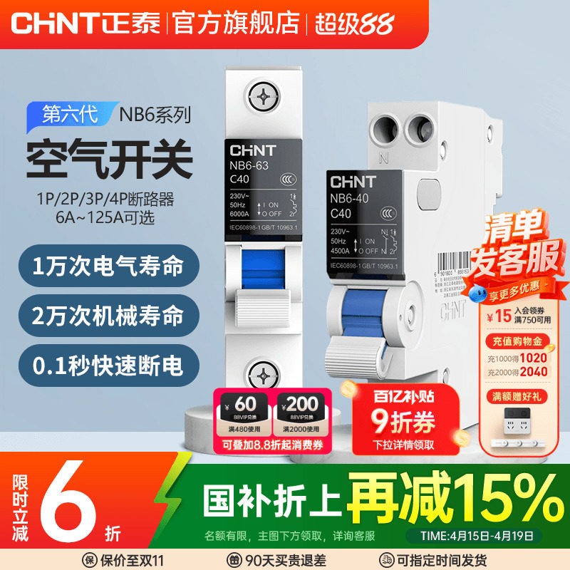 正泰官方旗舰店NB6断路器1P2P空气开关63A不带漏电保护3P空开家用