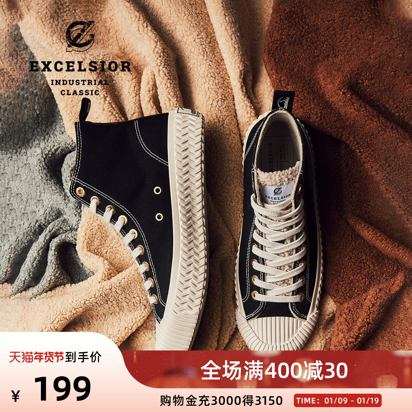 excelsior饼干鞋 秋冬新款板鞋加绒女鞋黑色休闲鞋厚底高帮帆布鞋