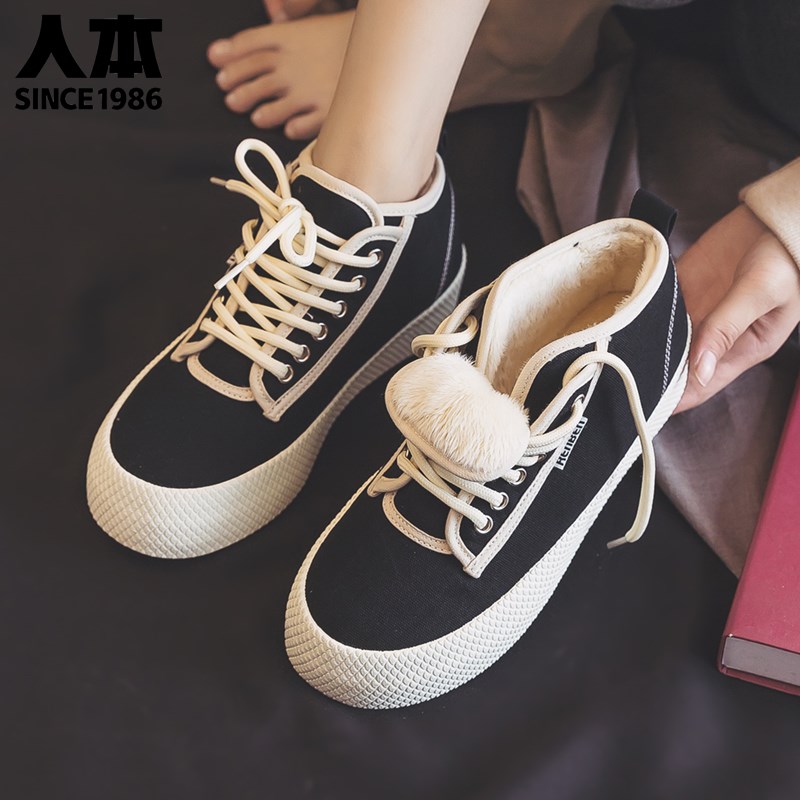 人本女鞋冬季加绒帆布鞋学生棉鞋中高帮透气平跟板鞋休闲鞋保暖鞋