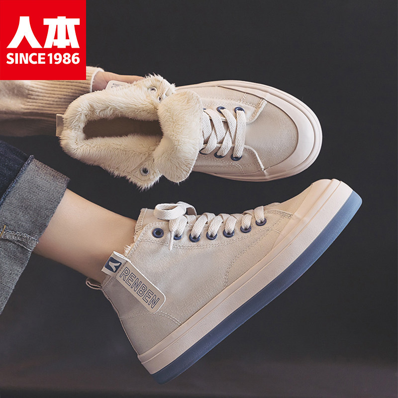 人本女鞋高帮帆布鞋女加绒棉鞋保暖中帮休闲学生板鞋2025冬季新款