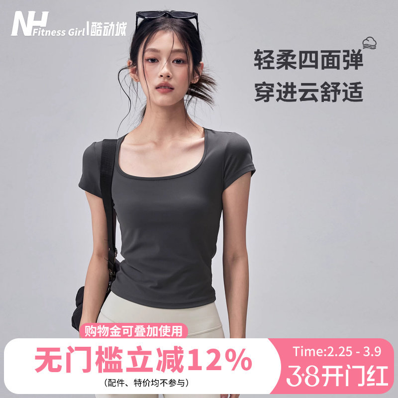 健身女孩瑜伽服短袖夏弹力显瘦运动上衣方领修身普拉提训练T恤薄