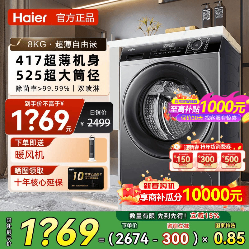 【立减15%】海尔滚筒洗衣机8KG超薄全嵌家用全自动EG80MATE33S