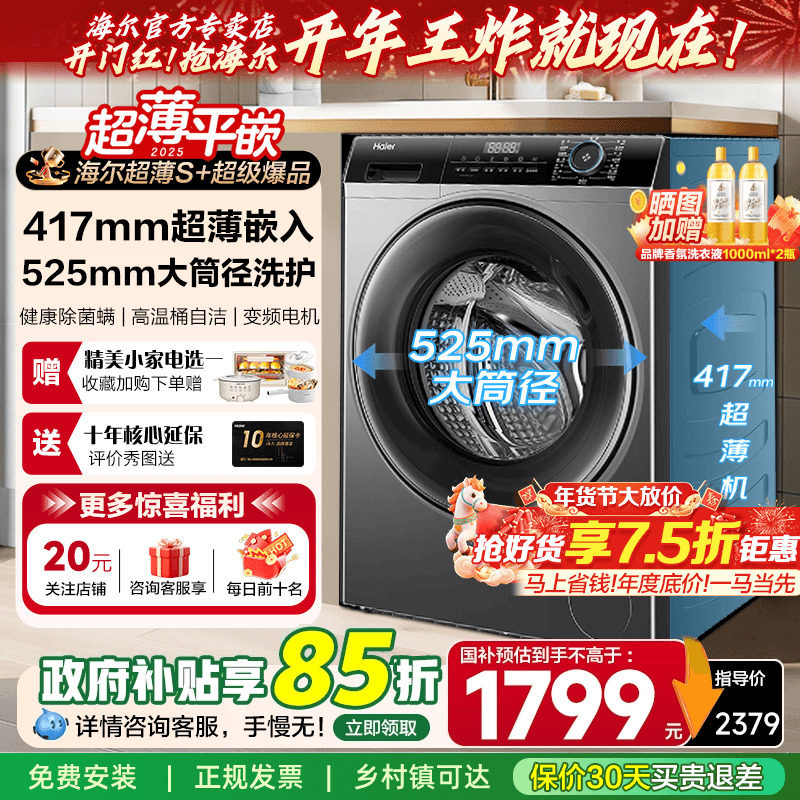 [以旧换新补贴]海尔40cm厚纤薄滚筒洗衣机8/10/11kg全自动家用33S
