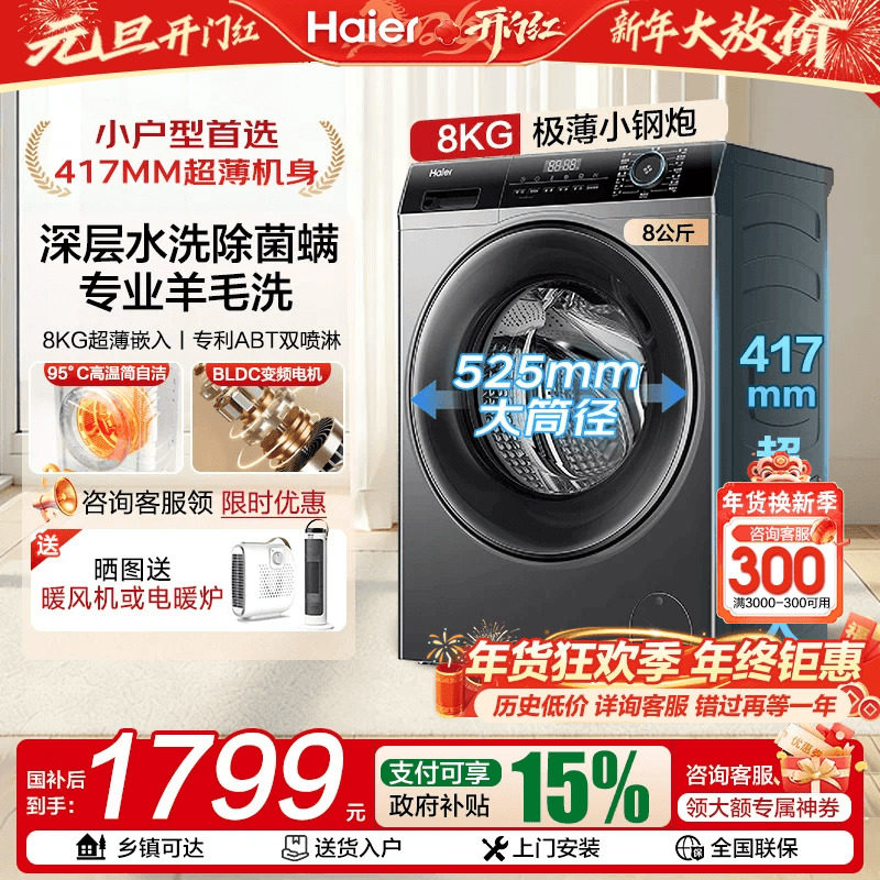 以旧换新补贴海尔40cm厚滚筒洗衣机8公斤全自动小户型家用官方33S