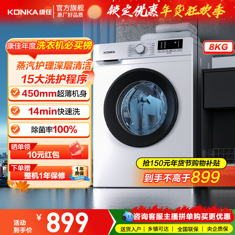 康佳洗衣机8公斤滚筒全自动小尺寸家用大容量超薄除菌螨洗脱一体