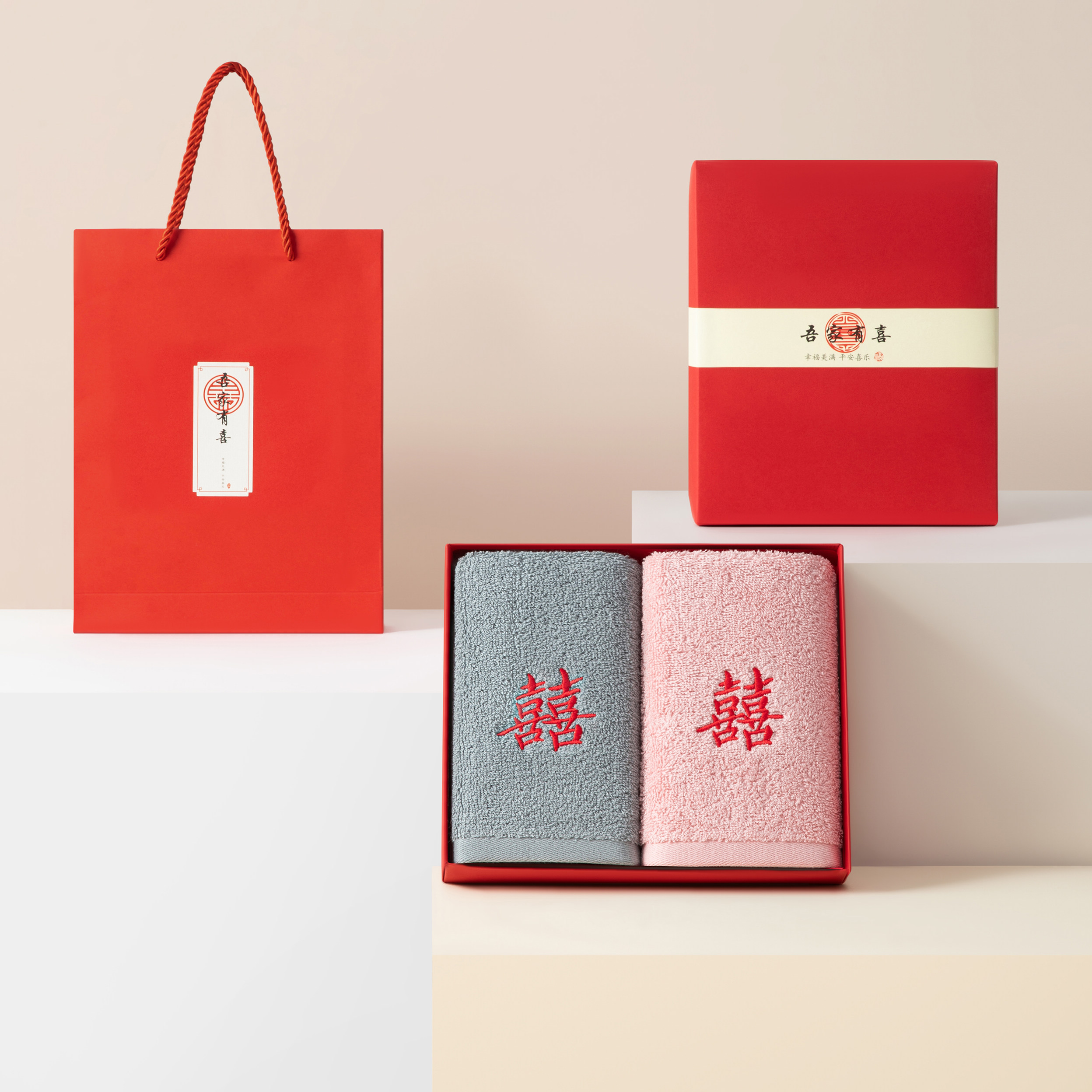 纯棉A类级别喜字陪嫁毛巾1对结婚浴巾套装礼盒喜事回礼西梦家纺