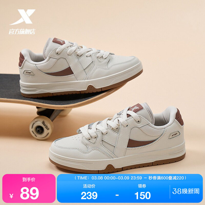特步板鞋男鞋春季新款休闲鞋情侣运动鞋女鞋白色百搭皮面小白鞋子