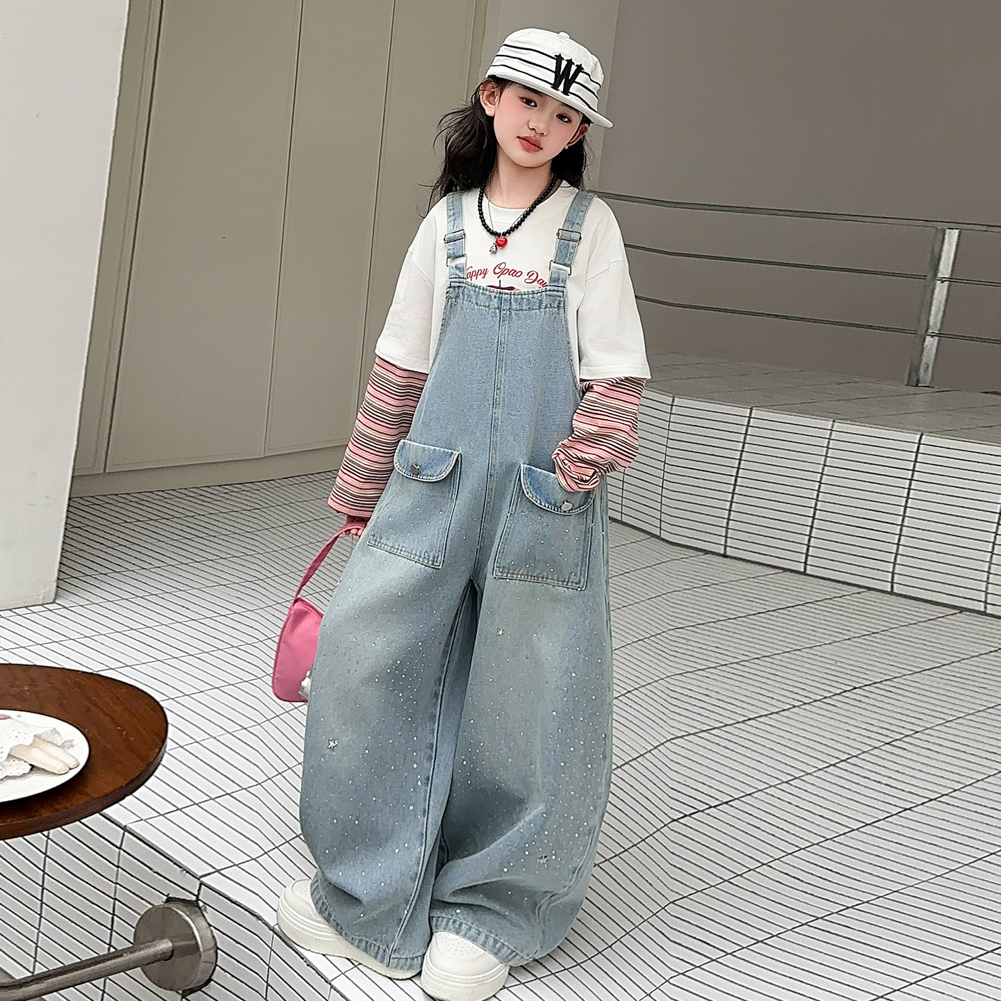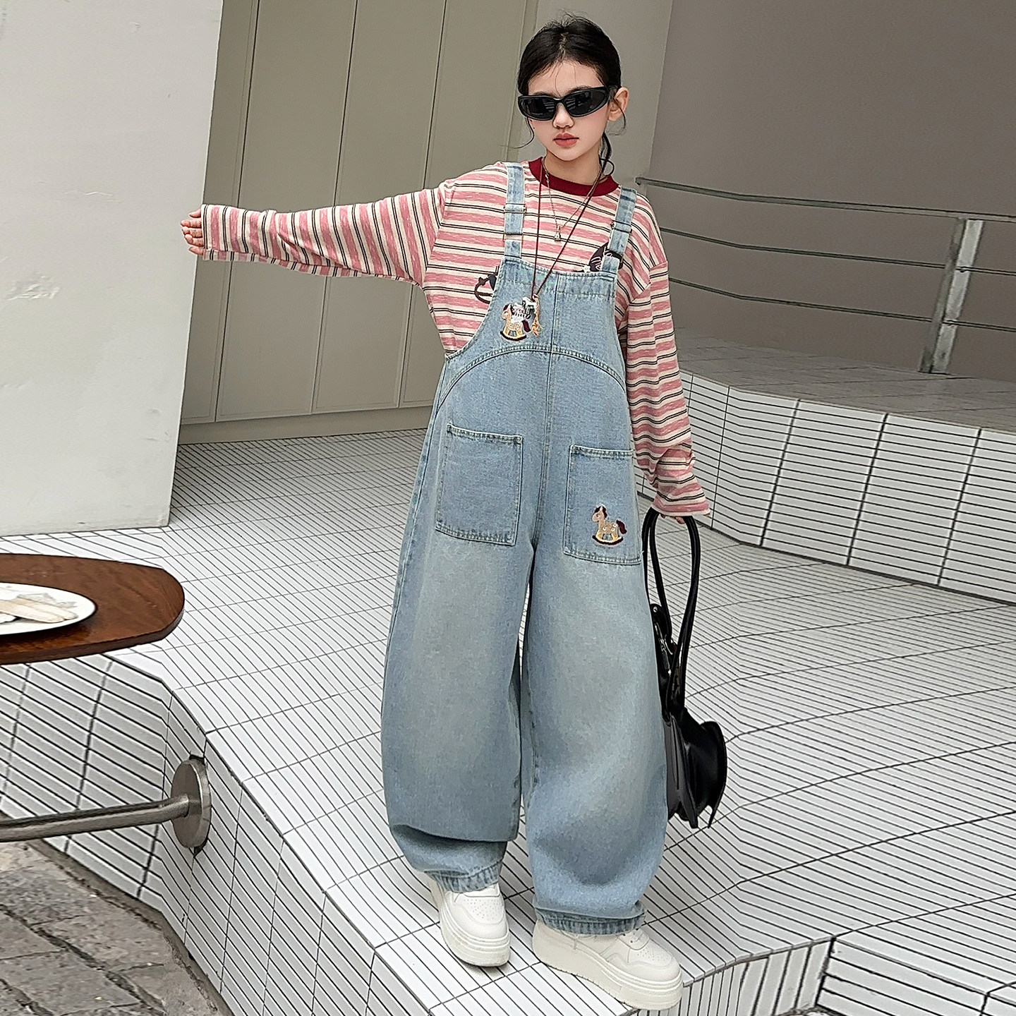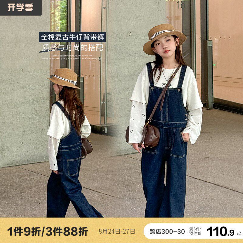 女童牛仔背带裤直筒宽松阔腿秋装儿童连体裤长裤中大童休闲长裤子