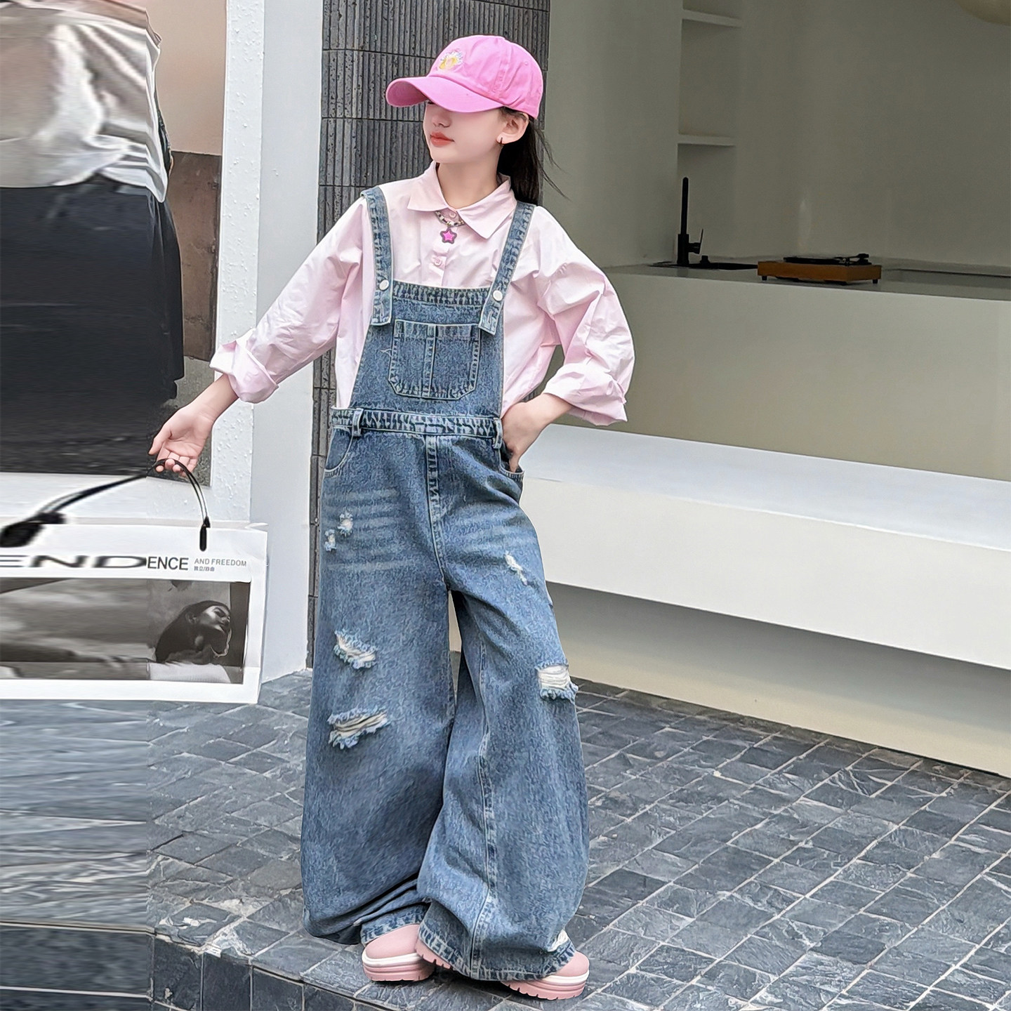 女童牛仔背带裤套装春秋装2026新款儿童洋气中大童衬衫破洞吊带裤