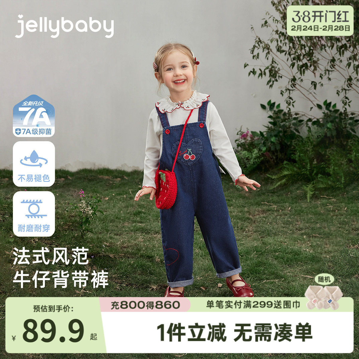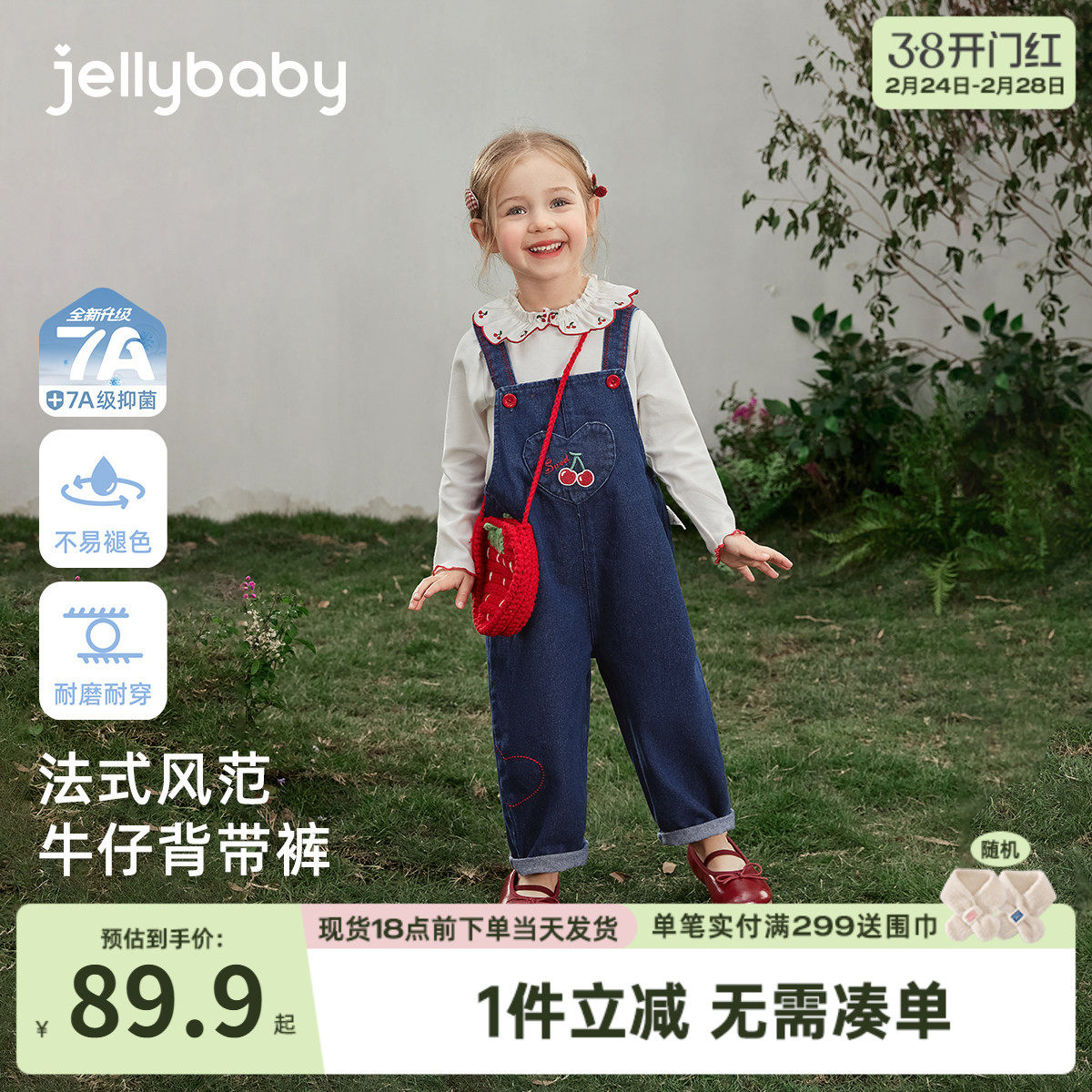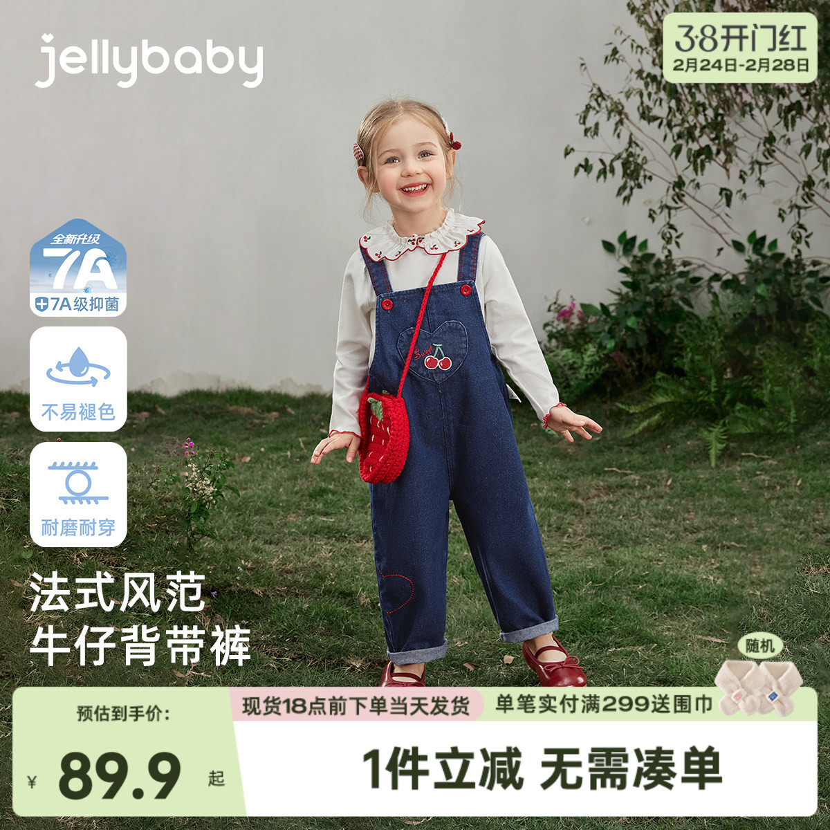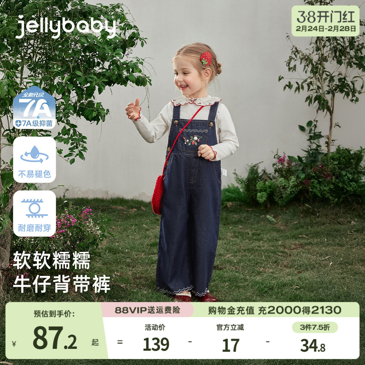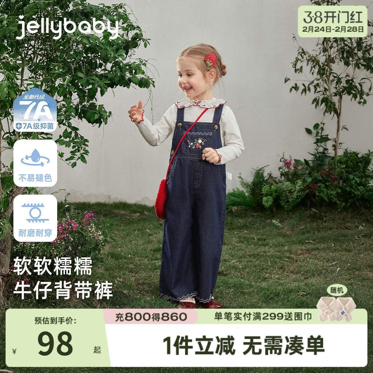[7A抗菌]女童牛仔背带裤2026新款水洗长裤春宝宝春季刺绣儿童裤子