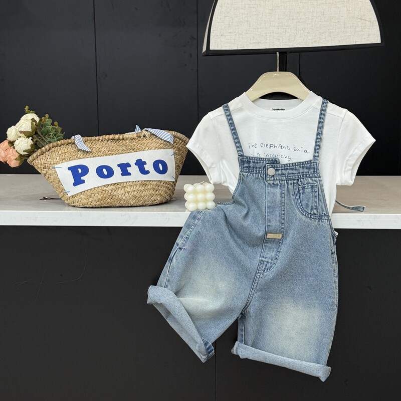 女童牛仔背带裤夏季套装2025新款洋气网红短袖中大童两件套潮