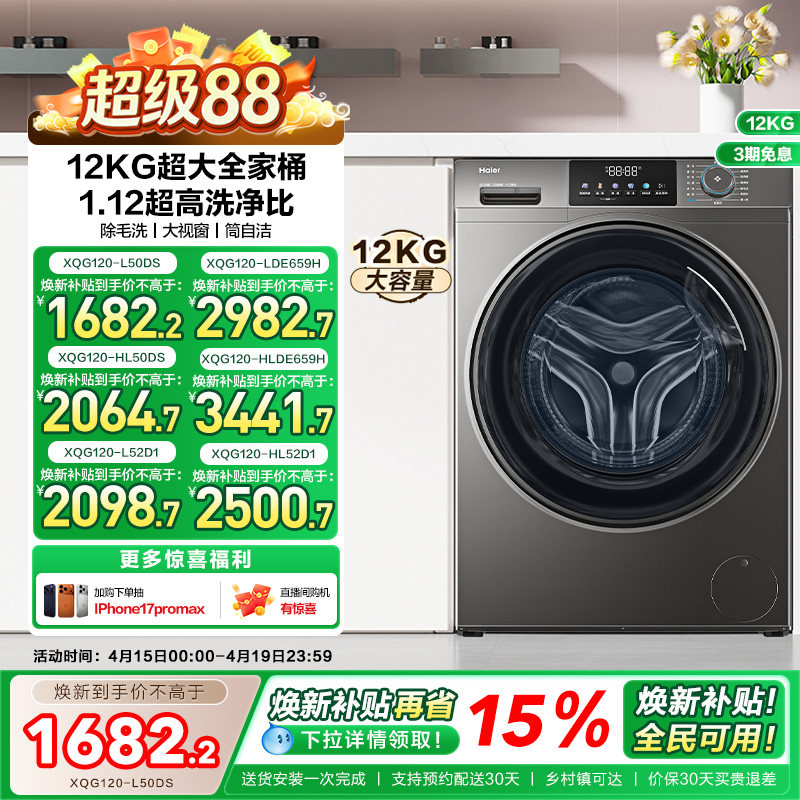 [以旧换新]海尔滚筒洗衣机12公斤家用全自动大容量洗脱一体50DS