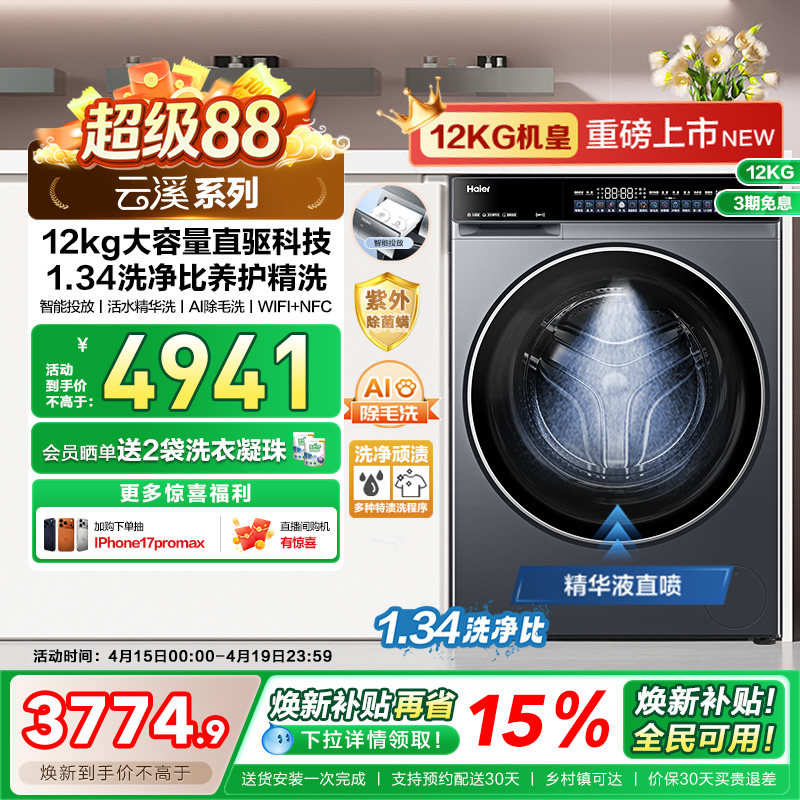 【李佳琦直播间新品专场】[云溪5.0 D3]高配海尔滚筒12KG洗衣机D3