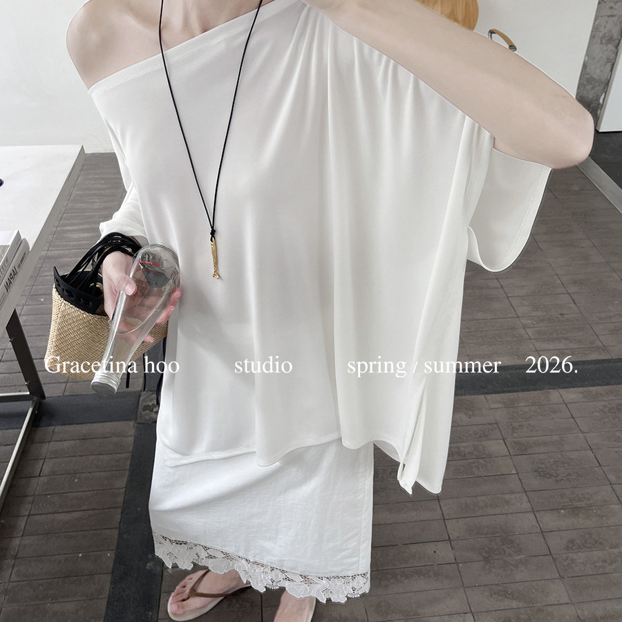 GRACETINA HOO|法式温柔时髦通勤|天丝一字领斜肩长袖衬衫女春