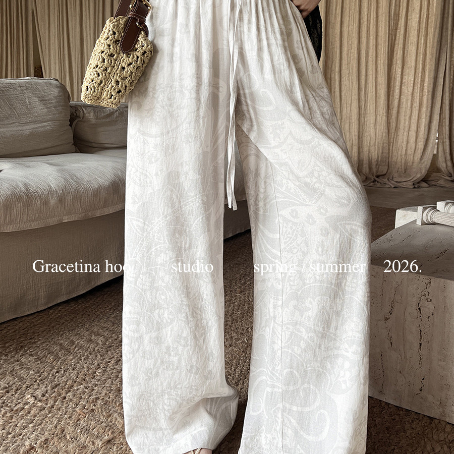 GRACETINA HOO-式亚麻腰果提花松弛随性ROW风抽绳阔腿休闲裤KA759