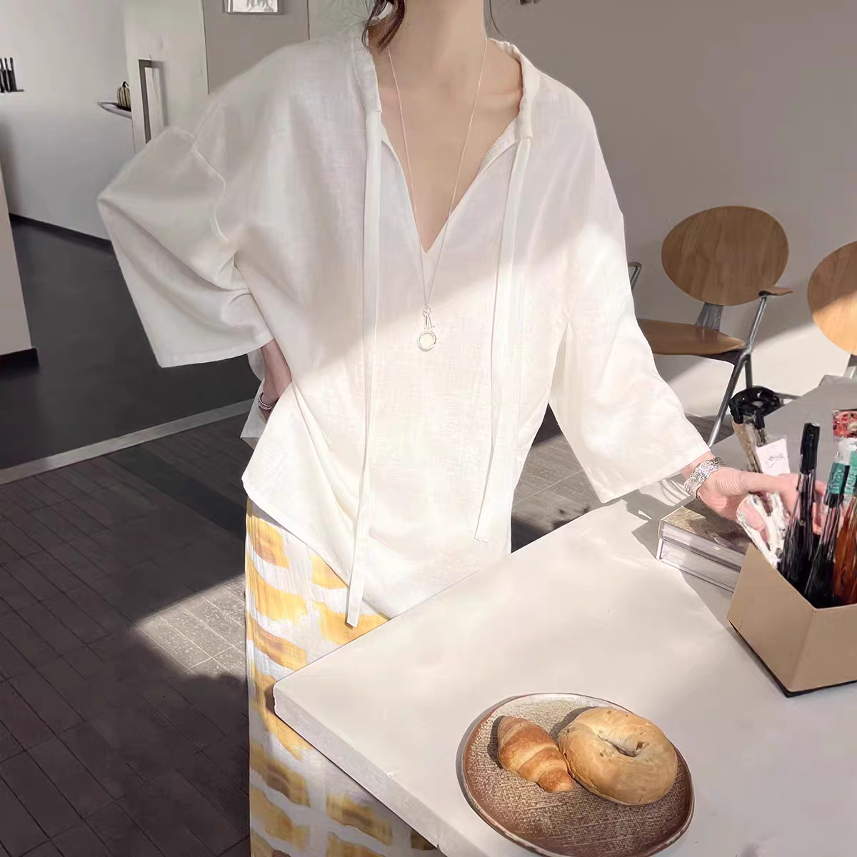 GRACETINA HOO|法式简约松弛感通勤|天丝亚麻V领长袖衬衫女春夏
