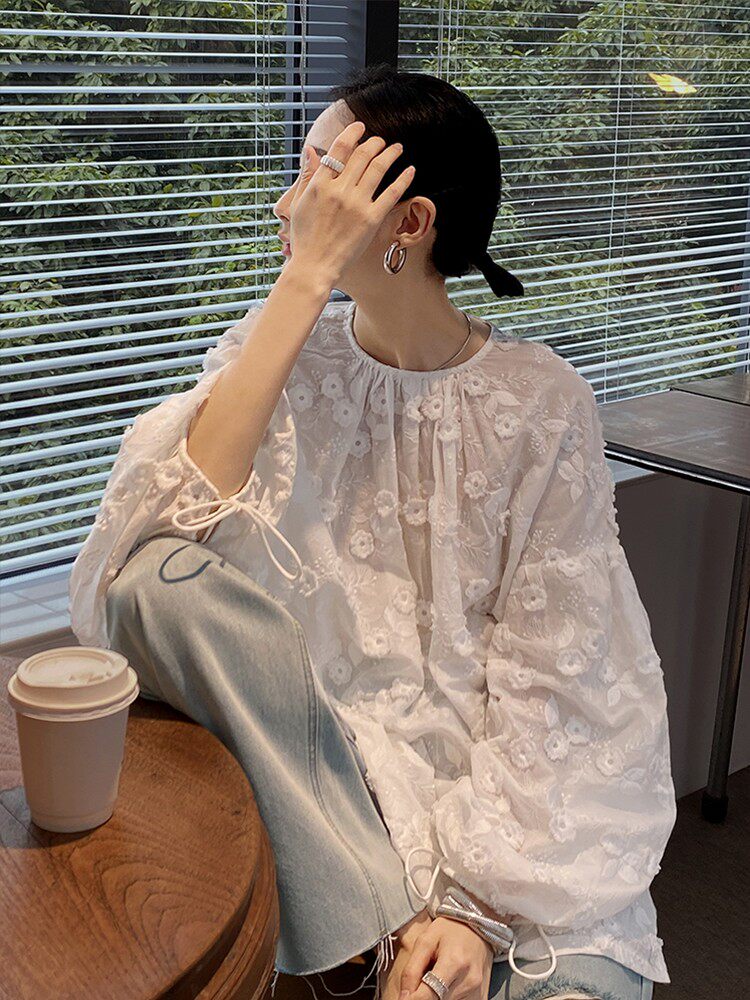GRACETINA HOO2026新款小众法式慵懒重工立体绣花泡泡袖系袋衬衫