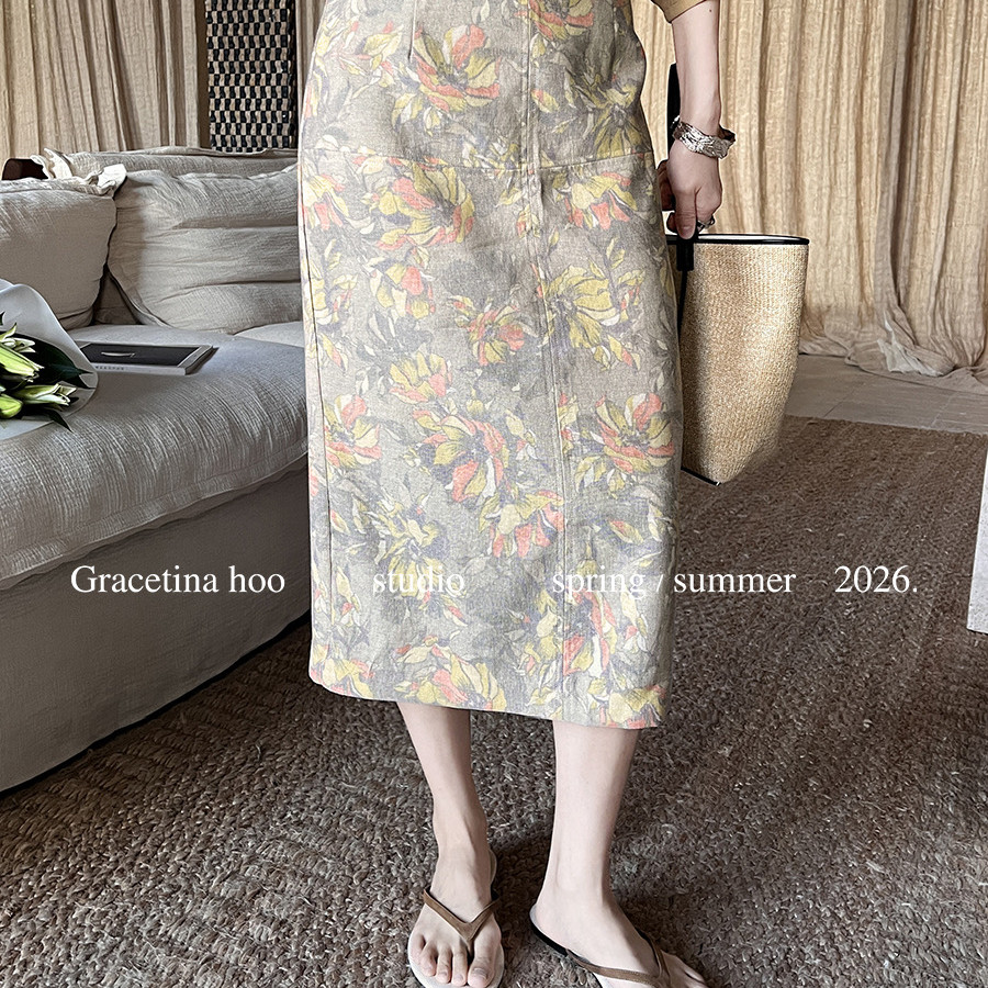 GRACETINA HOO-5亚麻55人棉法式定染花卉分割剪裁慵半身裙BQA461