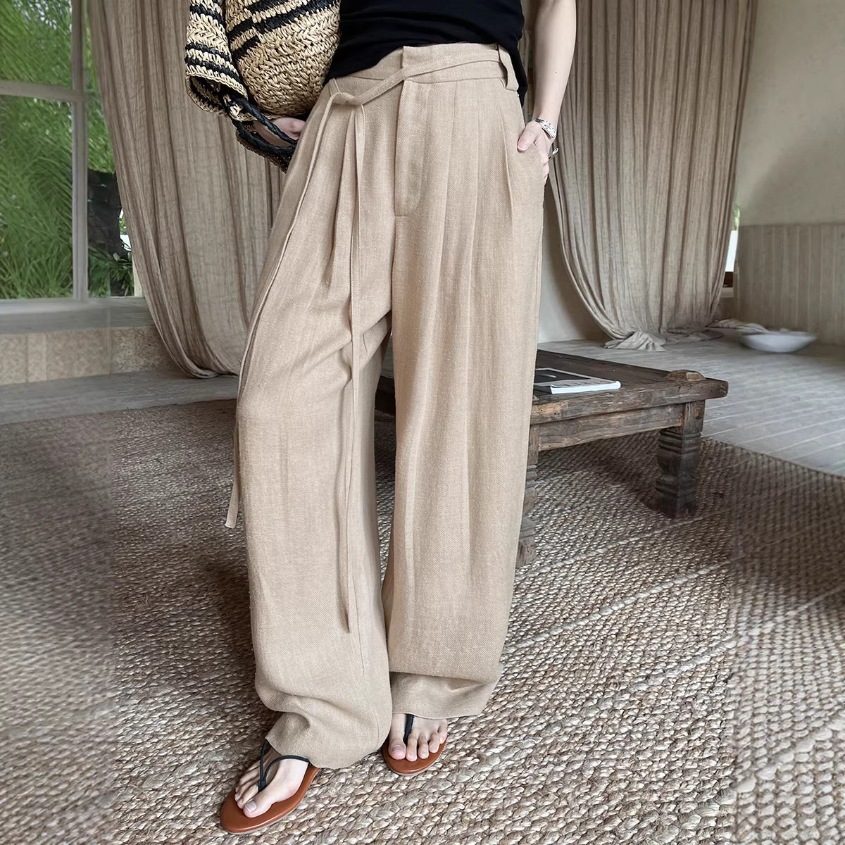 GRACETINA HOO-麻慵懒松弛高智感通勤百搭系带阔腿休闲裤(配腰绳)