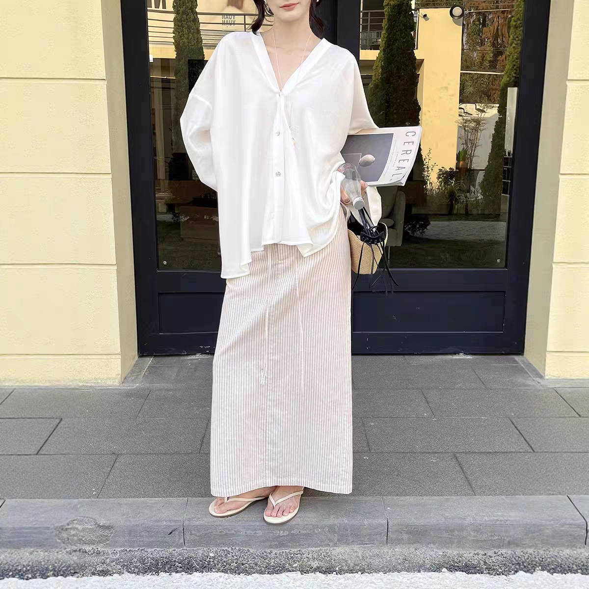 GRACETINA HOO|法式简约松弛通勤|棉麻色织条纹直筒半裙女春夏