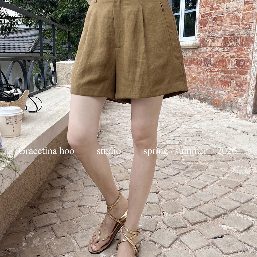 GRACETINA HOO-65天丝35苎麻法式天丝苎麻打褶简约高腰短裤KA285