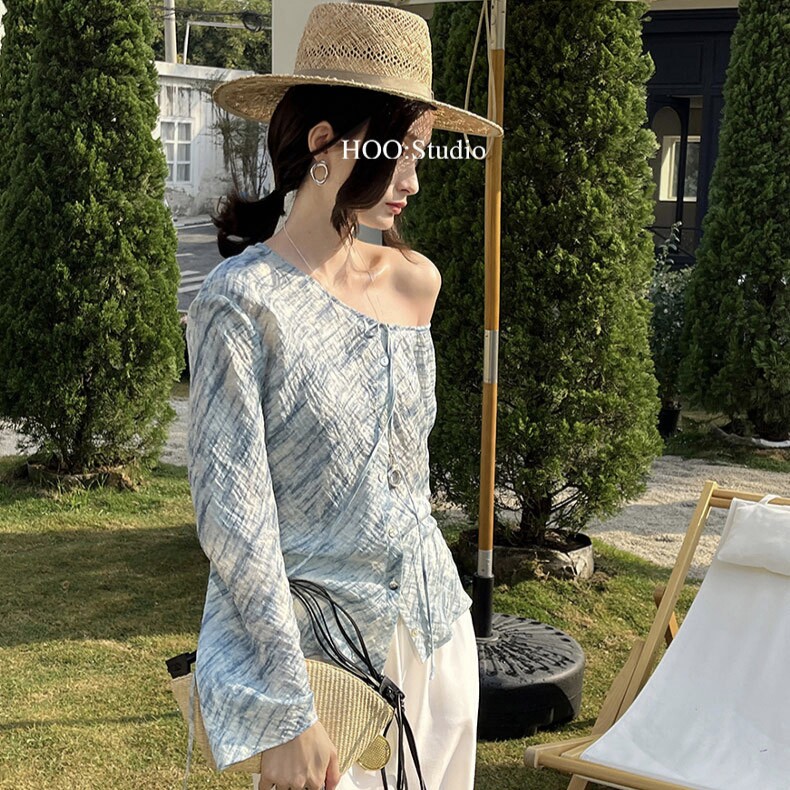 GRACETINA HOO|法式温柔高级通勤|天丝提花一字肩长袖衬衫女春