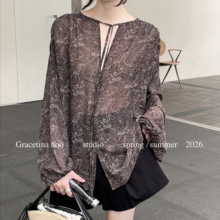 GRACETINA HOO|法式复古高智通勤|腰果花一字领长袖衬衫女春夏