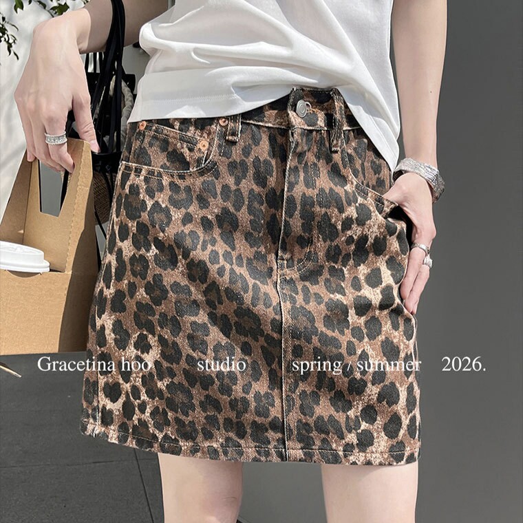 GRACETINA HOO|法式复古时髦通勤|全棉酵洗豹纹牛仔短裙女夏