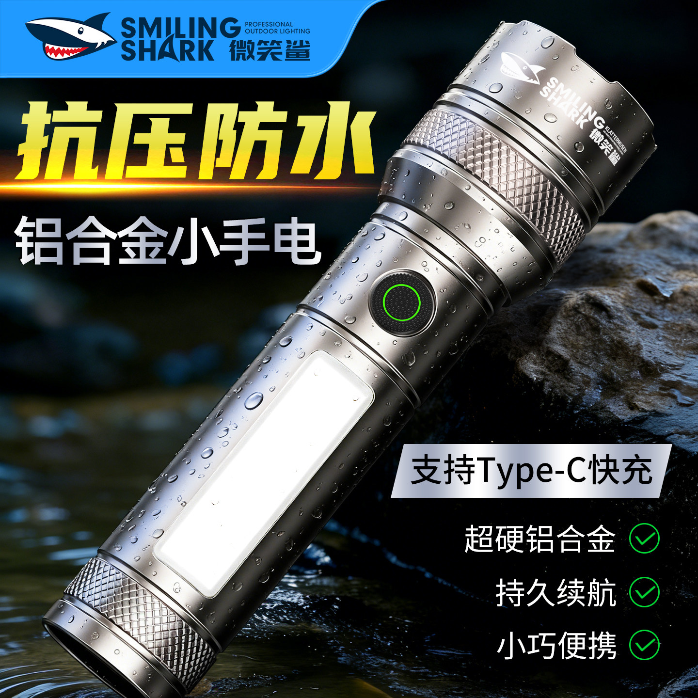 微笑鲨手电筒强光充电迷你超亮远射户外小便携家用防水学生长续航