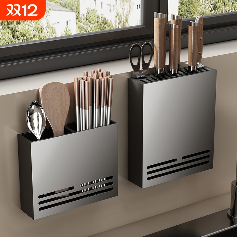 304不锈钢厨房刀架壁挂式刀具收纳架菜刀架筷子筒一体免打孔上墙