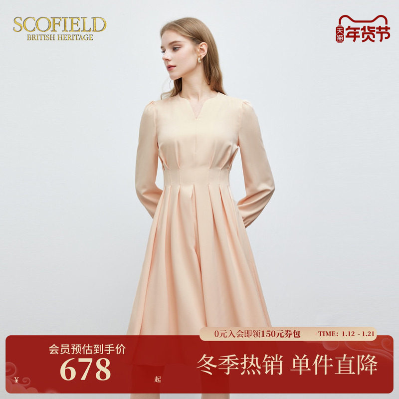 Scofield女装优雅V领风琴褶连衣裙气质通勤垂坠感裙子夏季